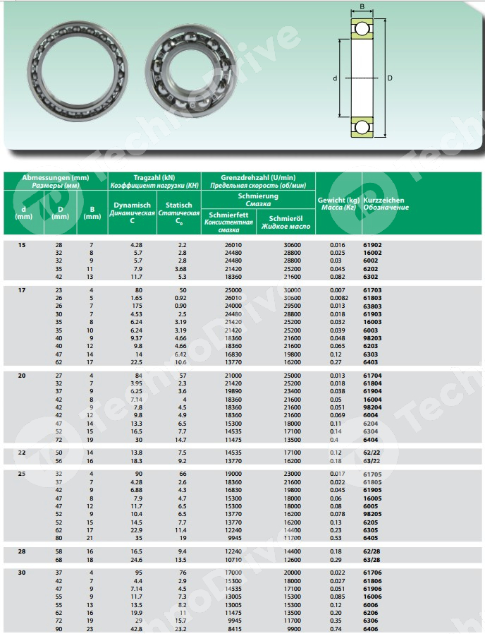 | Предельная скорость (жидкое масло), об/мин | 28800 |