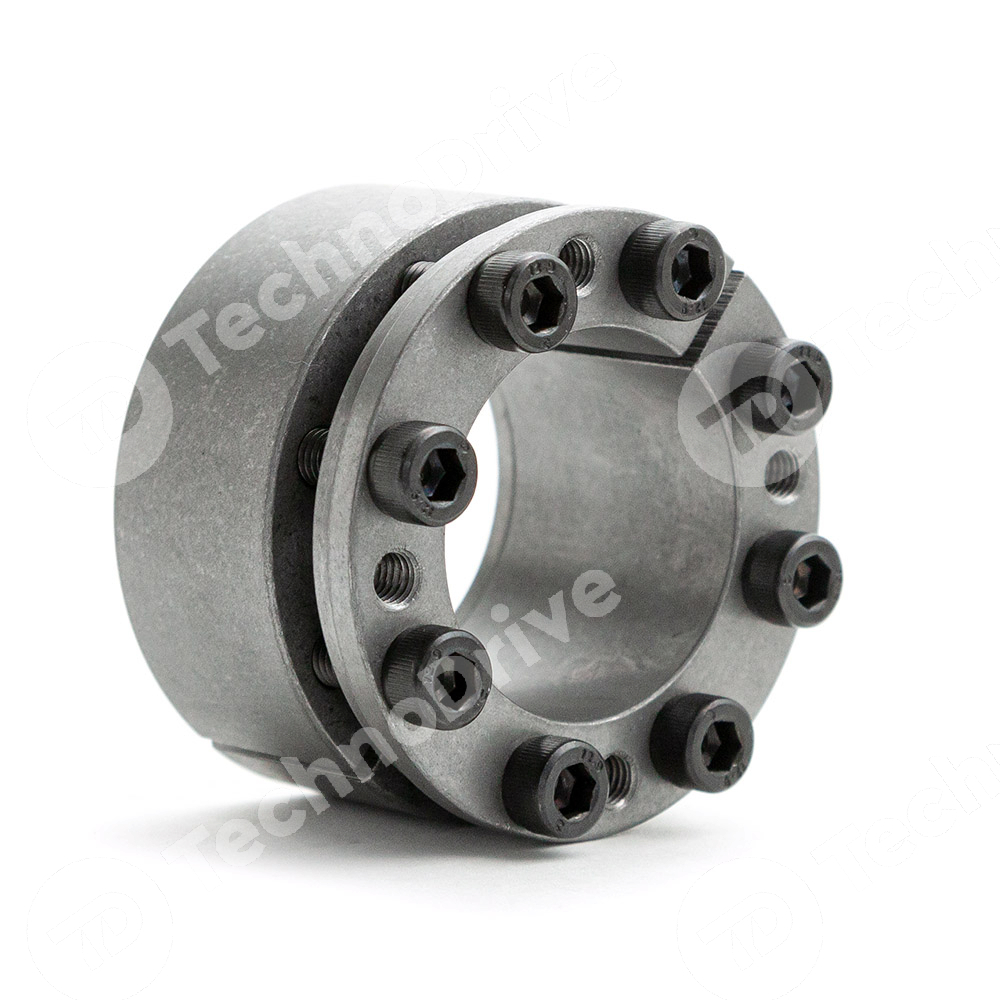 Изделие состоит из двух колец и специальных болтов. Внутреннее кольцо имеет цилиндрическое отверстие под посадку на вал и конический наружный профиль. Внешнее кольцо, наоборот, выполнено с цилиндрическим наружным диаметром и коническим внутренним. При вкручивании болтов втулка плотно зажимается на валу и надежно фиксирует деталь, приводимую во вращение. Работа изделия основана на встречном смещении усеченных конусов при затяжке болтов. За счет увеличения внешнего диаметра втулки и уменьшения внутреннего возникают силы трения, которые и обеспечивают надежную фиксацию всех элементов конструкции. В зажимных втулках, как правило, предусмотрены резьбовые отверстия для монтажа и демонтажа. В зависимости от исполнения изделие может иметь стопорное или упорное кольцо.